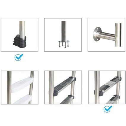 Лестница для облегченного спуска Aquaviva MUS-215. Изготовлена из нержавеющей стали, идеально подойдет для частных и коммерческих бассейнов. Монтаж лестницы выполняется в верхней части бассейна при помощи болтов из нержавеющей стали и закладного стакана (анкера). Нижняя часть лестницы упирается в стену бассейна резиновыми заглушками. Крепеж не нарушает гидроизоляцию чаши бассейна. Специальная наклонная конструкция лестницы обеспечивает удобный доступ в воду и обратный выход из нее.